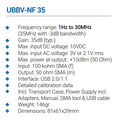 | プリアンプ | Aaronia | UBBV NF35 | 35dB Preamplifier | 1Hz - 30MHz |