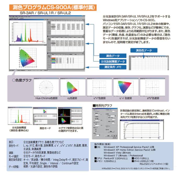 分光放射計SRシリーズをサポートするWindows用アプリケーションソフトCS-900Aが標準付属しております。CS-900A上よりSRシリーズ本体の制御や測定データの収集・グラフ化・演算・保存が簡単にでき、豊富なデータ処理により応用範囲が広がります。また照度アダプタ(オプション品)をSRシリーズ本体に取付けて測定した場合、分光照度の評価も行えます。