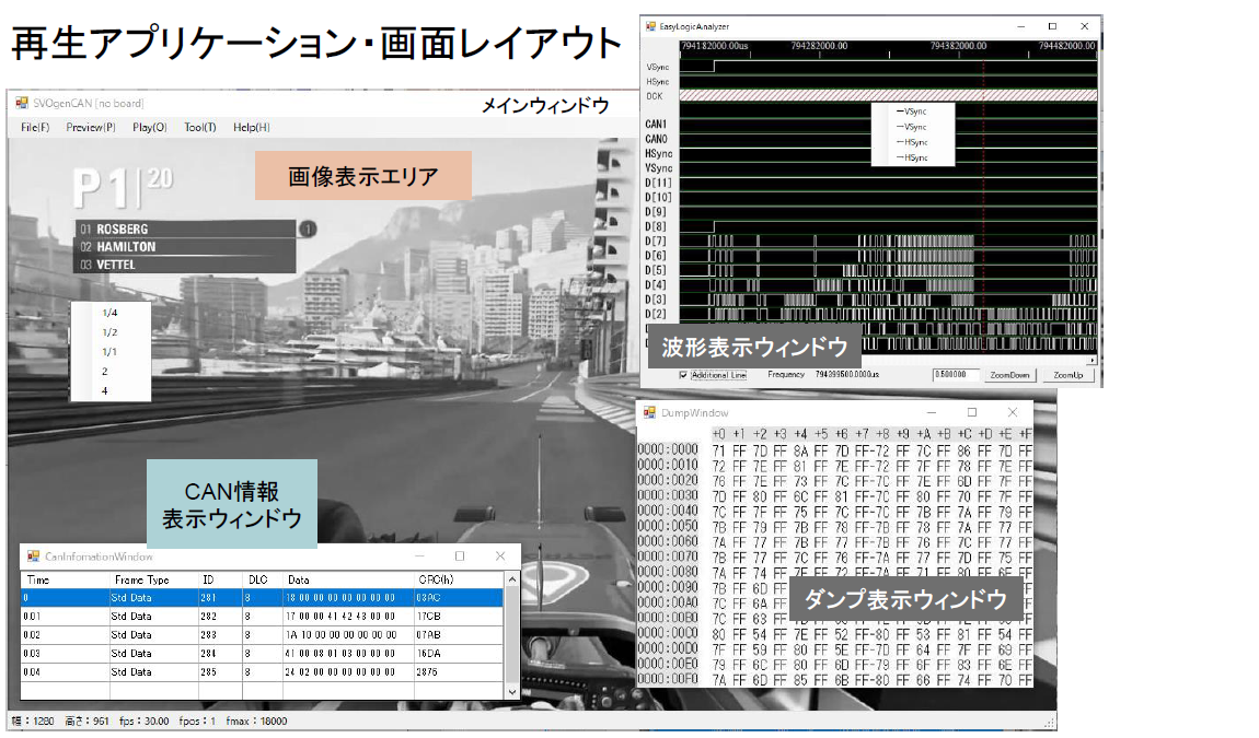 画像とCANデータをピクセルクロック単位でリアルタイム再生できます。画像と画像波形、CANデータはリンクされております。画像をクリックすると、そのピクセル部分の画像波形とCANデータが表示されます。Hシンク、Vシンクでの表示切替も可能ですので、今までにない車載内通信デバッグ環境が構築できます。