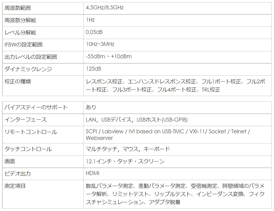 SNA5000Aは、散乱パラメータ測定、差動パラメータ測定、受信機測定、タイムドメイン・パラメータ解析、リミットテスト、リップルテスト、エンチャント・タイムドメイン・パラメータ解析(TDR)に対応しています。