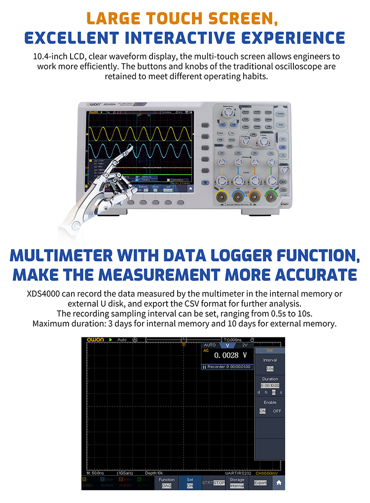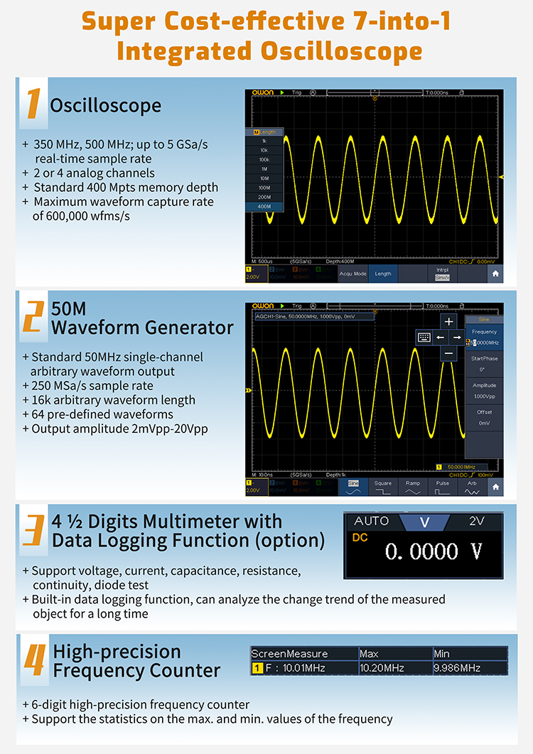 - 多機能タッチオシロスコープ 5GSa/s, 最大500MHz OWON