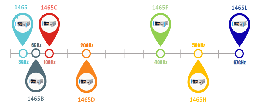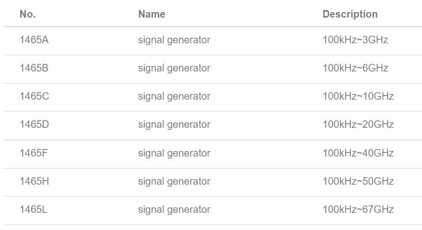 1465A / B / C / D / F / H / L信号発生器の場合、周波数範囲は100kHz〜3GHz / 6GHz / 10GHz / 20GHz / 40GHz / 50GHz / 67GHzです。これらの7つのシリアル化されたモデルでは、1465A / Bの場合、選択可能な最小出力周波数は9kHzであり、1465Lの場合、選択可能な最大出力周波数は70GHzです。各モデルには、機能とパフォーマンスの拡張に使用できるさまざまなオプションがあります。計測ソリューションや基本的な信号発生器に関係なく、常に1つのモデルがあり、無線周波数範囲のテスト信号または信号周波数のミリ波のみがあります。