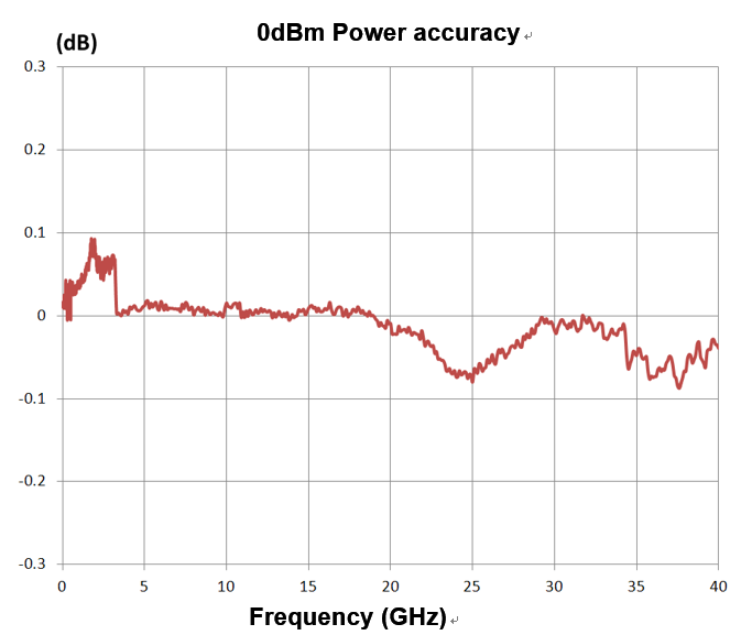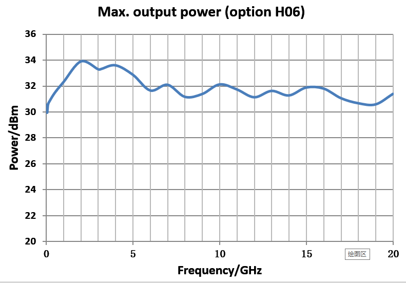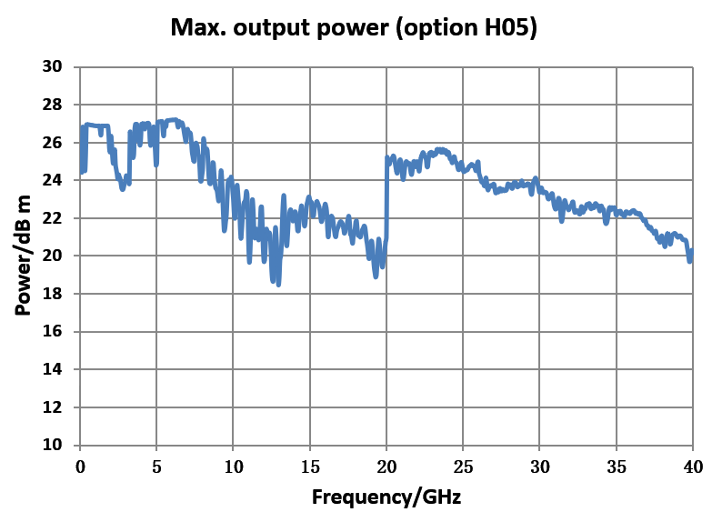 H05ハイパワーオプションでは、最大出力パワーの一般的な値は、20GHzの場合は+ 22dBm、40GHzの場合は+ 20dBm、67GHzの場合は+ 10dBmです。 H06拡張ハイパワーオプションを使用すると、出力パワーは+ 30dBm(1W)になります。 テストで高出力の入力信号が必要な場合、外部アンプなしで必要なテスト信号を取得でき、より高い電力精度と安定性が実現されます。