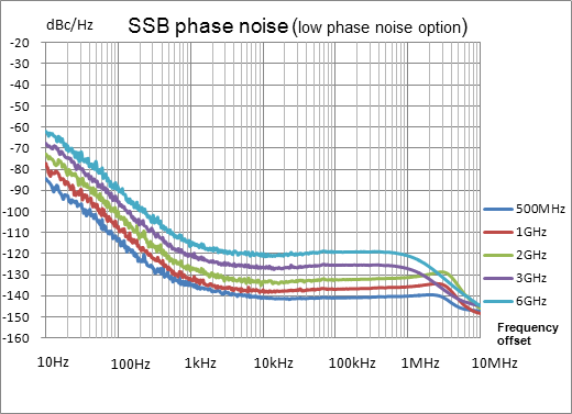 1435 Vシリーズの信号発生器は、2段階のSSB位相ノイズをユーザーに提供します。 標準のSSB位相ノイズは-104dBc / Hz(6GHz @ 10kHz)で測定され、低位相ノイズオプションが選択されている場合、SSB位相ノイズは-120dBc / Hz(6GHz @ 10kHz)まで低くなる可能性があります。 ユーザーは、最適なコストパフォーマンスを実現するために、必要に応じて位相ノイズを選択できます。