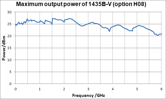 H08ハイパワー出力オプションを選択した場合、1435-Vシリーズ信号発生器のフルバンド出力パワーの測定値は20dBmを超える可能性があります。 高出力の励起信号が必要なテストでは、1435-Vシリーズの信号発生器を使用して、外部アンプなしで必要なテスト信号を取得できます。