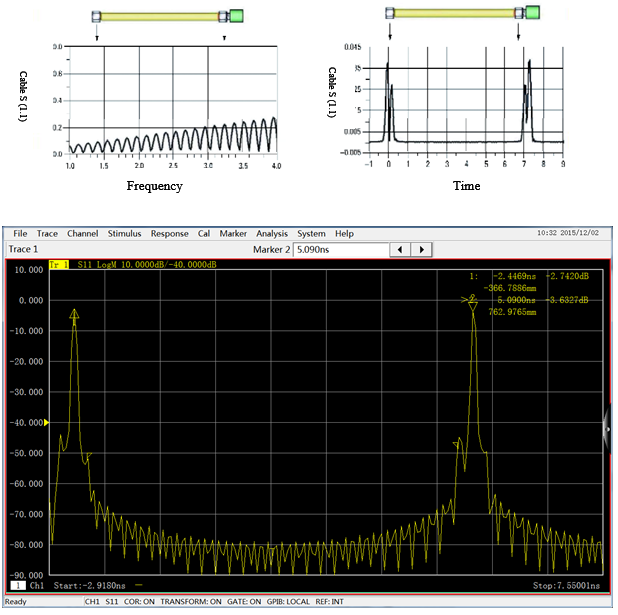 時間領域オプションを使用すると、3672シリーズベクトルネットワークアナライザは、周波数領域データの逆フーリエ変換を計算して、反射係数または透過係数を時間に対して表示します。これにより、DUTの不連続点を検出し、DTFを正確に特定できます。