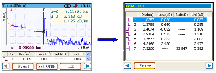 6416 OTDRの自動測定機能により、操作内容を知らなくても簡単に試験を行うことができます。 手順は簡単です。ファイバーを接続し、【開始】を押すだけで、機器は最適なテスト条件を設定し、テスト曲線やイベントテーブルなどの正確なテスト結果を表示します。
