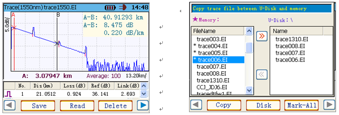 6416 OTDRは強力なファイル管理機能を提供します。 機器内またはUSBディスクからファイルを検索、参照、または削除できるだけでなく、レーザープリンターまたはインクジェットプリンター(PCL言語に基づく)に接続してテストレポートを印刷することもできます。