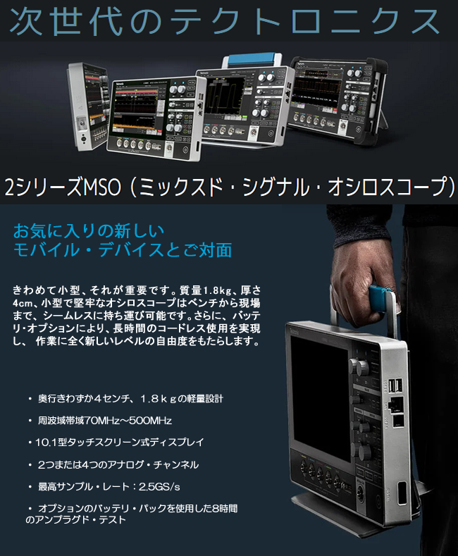 2シリーズMSOミックスド・シグナル・オシロスコープは薄型、軽量デザインで、最長8時間のバッテリ駆動。数多くの受賞歴を持つ、直感的なタッチスクリーンでスマートフォンのように使い慣れたユーザ・インタフェースでシリアル・デコードなど測定機能も充実しています。
