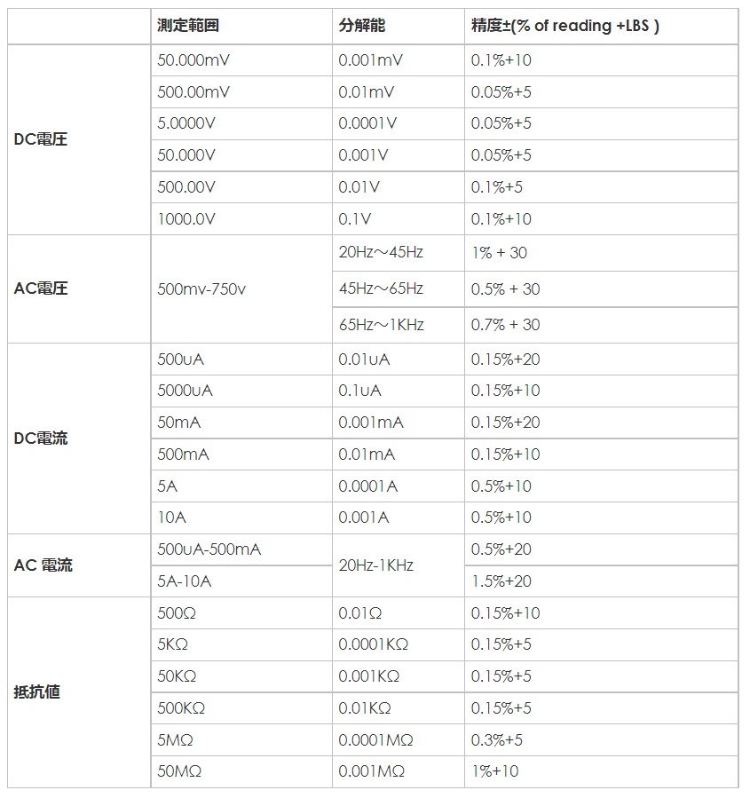 - ●AC True RMS測定、測定帯域幅:20Hz-1kHz