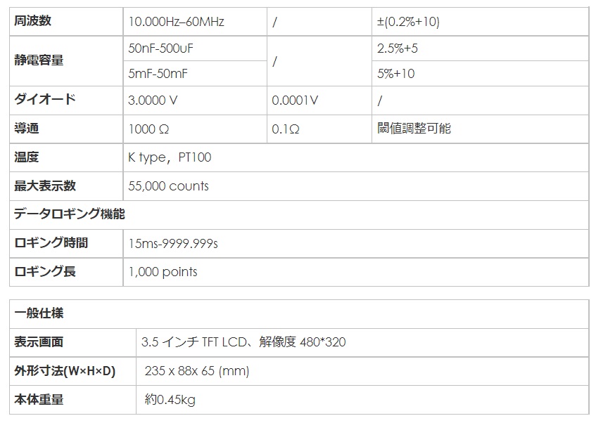- ●測定機能:DC/AC電圧、DC/AC電流、抵抗、静電容量測定、連続性試験、ダイオード試験、温度測定、DC/AC電圧、DC/AC電流、抵抗、静電容量測定