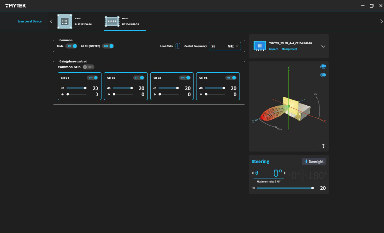 BBox Oneは4個のRFチャンネルを内蔵し、それぞれ独立して振幅と位相の制御ができるユニットです。外部の信号源より28GHz帯の信号を1系統入力し、専用ソフトウェア若しくはAPIを用いて作成されたプログラムから4チャンネルの信号制御が可能です。 5G通信デバイス開発、評価は勿論のこと、ビームフォーミングの学習や研究開発などに広くご使用頂ける画期的なデバイスです。