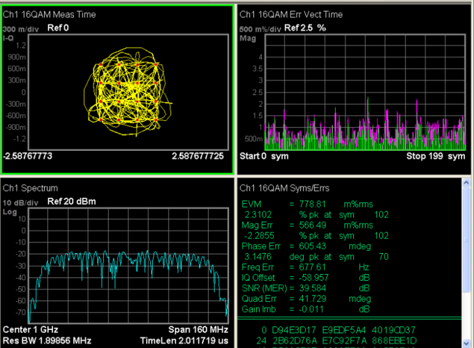 - IQ変調は、情報を送信する非常に効果的な方法です。SSG5000Xは、QAM、PSK、ASK、FSKのような一般的な変調信号を出力することができます。シンボルレートは、120 Msps まで設定できます。