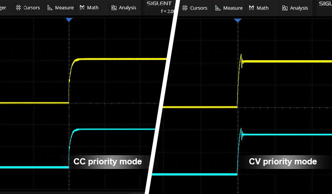 SPS5000Xシリーズ電源をCC優先モードに設定すると、電源出力オンの段階で、CC優先で動作して、電源出力オン時の突入電流スパイクやオーバーシュート電圧を効果的に制限することができます。