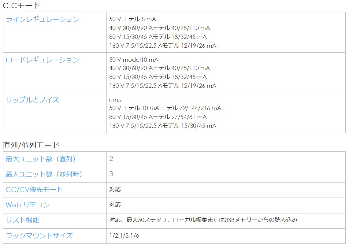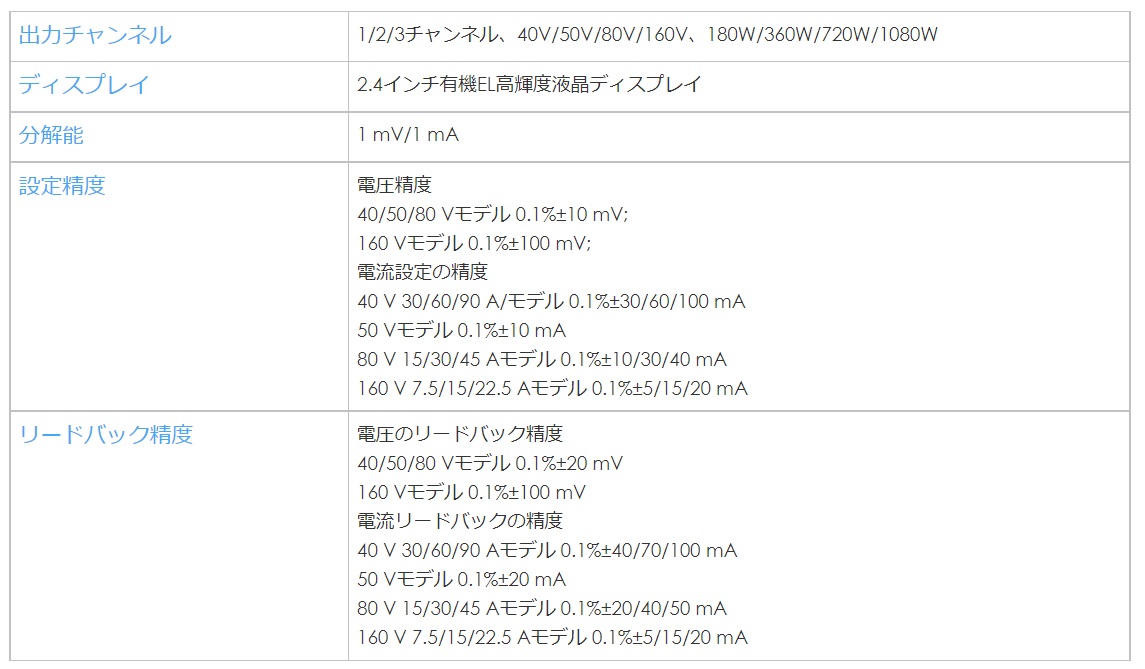 SPS5000Xシリーズは、出力電圧(40V、50V、80V、160V)と電流の組み合わせ(7.5A~90A)が豊富で、定格出力は180W、360W、720W、1080Wを用意しています。1チャンネルモデルは最大2台までの直列接続と3台までの並列接続に対応し、2チャンネルモデルと3チャンネルモデルはチャンネル間の直並列接続にも対応しています。