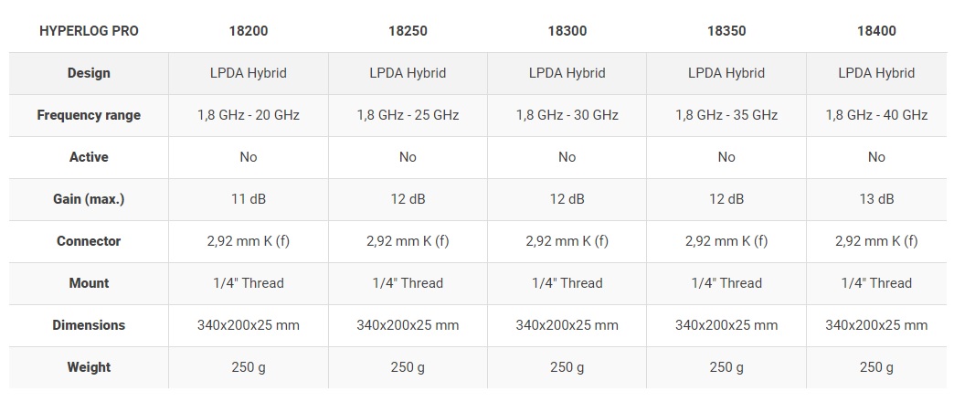 | HyperLOG PRO 18250 | 2GHz~25GHz | 12dBi |