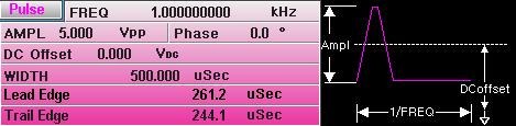 全モデルに最高周波数25MHzのパルスジェネレータ出力が搭載されています。パルス幅、デューティ比、立上り時間、立下り時間による設定が可能で、5Vppの出力が可能です。