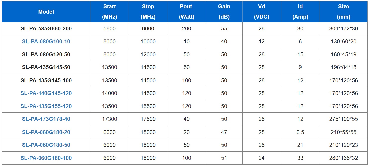 Skylink は、ブロードバンドおよび帯域固有のソリッド ステート パワー アンプの設計における豊富な経験を活かして、R&D への投資を継続し、堅牢で電力効率が高く、費用対効果の高いソリューションを生み出しています。当社のブロードバンドおよび帯域固有の高出力アンプは、電子戦、通信、EMC、および製品テストにおける独自のソリューションのために当社のユニットの性能を構築する OEM システム設計者およびエンド ユーザーを提供します。