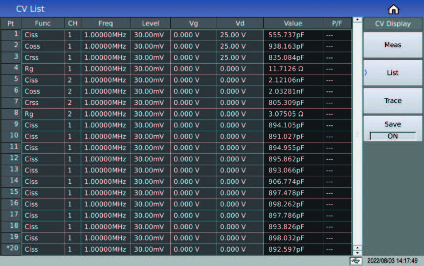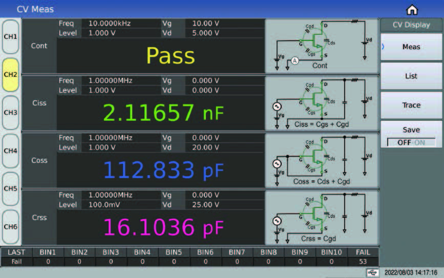 • 4 つの寄生パラメータ (Ciss、Coss、Crss、Rg) が測定され、同じ画面に表示される