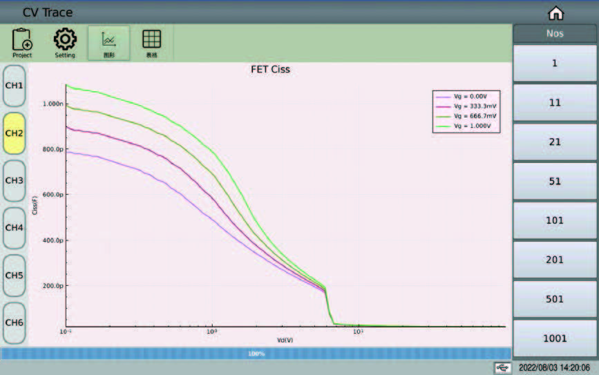 TH510 シリーズ半導体 C-V 特性アナライザは C-V 特性曲線分析をサポートし、対数的および線形的な方法で曲線スキャンを実現でき、同時に複数の曲線を表示できます: 同じパラメータと異なる複数の曲線
