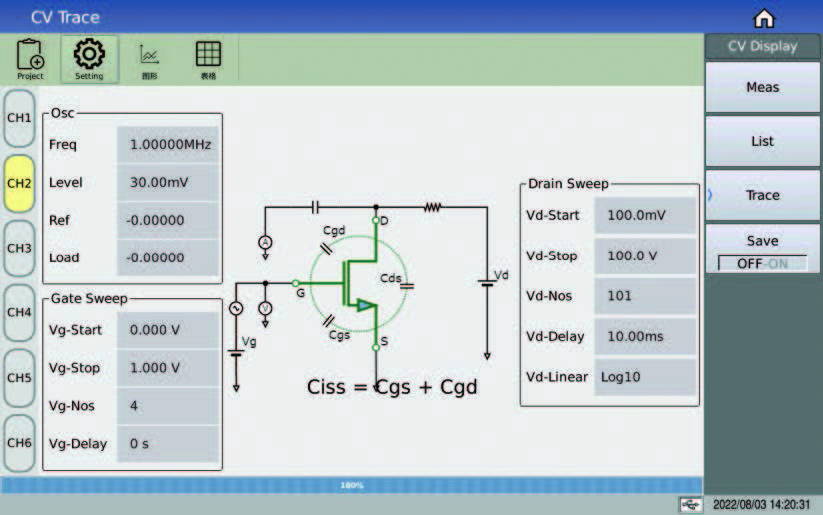MOSFET の 4 つの最も重要な寄生パラメータ: Ciss、Coss、Crss、Rg は、測定結果を同じインターフェイスに直接表示し、4 つのパラメータの等価回路図を同時に表示するので、一目でわかります。