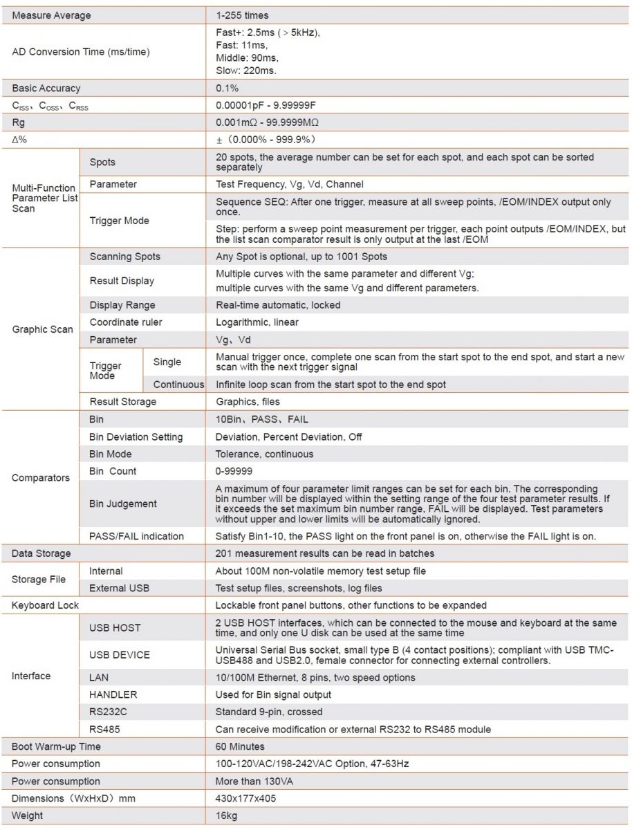 半導体デバイス C-V特性アナライザ TH510シリーズの設計周波数は1kHz~2MHzで、VGS電圧は±40Vに達し、VDS電圧は200V/1500Vに達します。