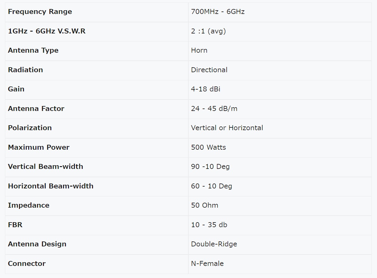 ダブルリッジブロードバンド導波管ホーンアンテナ 700MHz~6GHz