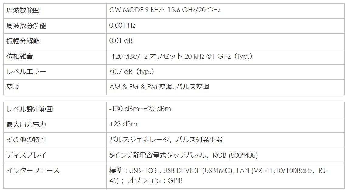 RF信号発生器 SSG5000Aシリーズ 製品紹介衛星通信、レーダー、最新の移動体通信システムは、マイクロ波帯の周波数で動作しています。設計エンジニアは、この分野の開発作業において、多くの課題に対処しなければなりません。これらを克服するためには、高性能な測定技術が必要です。SIGLENT は、新たに 26.5GHz までの X バンドおよび K バンド測定に対応した測定器を発表しました。この2つの測定器は強力なチームを形成し、問題の迅速な発見と解決に貢献します。その結果、エンジニアリング作業を時間内に終わらせることができるのです。 新製品のRF/MW信号発生器SSG5000Aは、最大20GHzまでのクリーンな正弦波を出力することが可能です。スペクトル純度、-120dBc/Hzの低位相雑音、パワー制御により、レーダー、量子物理学、RF部品検証など多くのアプリケーションで高周波LOとして使用することが可能です。また、SSG5000AをLO源として、SIGLENT SSG5000X-Vベクトル信号発生器をベースバンド発生器として組み合わせることで、通信モジュールのテストも可能です。SSG5000Aは、周波数掃引とレベル掃引の両方の機能を備えており、より高速なテストが可能です。パルス信号の生成も標準装備されており、サードパーティ製の一般的なUSBパワーセンサを制御してケーブル損失を補償した電源供給が可能です。 RF信号発生器 SSG5000Aシリーズ 主な機能●最大周波数:13.6 GHz / 20 GHz●周波数設定分解能:0.001 Hz●レベル設定範囲:-130 dBm ~ 25 dBm●位相雑音:-120 dBc / Hz @ 1 GHz、20 kHzオフセット(typ.)●レベル誤差 ≤ 0.7 dB (typ.)●AM、FM、PMのアナログ変調を内部、外部、Int+Extのソースで提供●シングルパルス,ダブルパルス,パルス列発生器 (オプション)幅広いアプリケーションに対応SSG5083A/SSG5085A マイクロ波信号発生器の出力周波数は 9 kHz から 13.6/20 GHz まで、AM & FM & PM 変調、パルス変調、パルスシーケンス発生、電力計コントロールなどの機能をサポートします。標準的な OCXO 基準ハードウェアモジュールにより、高精度、高安定性の信号出力を保証します。それはコミュニケーション、宇宙航空、国防および他の分野のために設計されています。また、R&Dや生産など様々な用途に対応します。パルスジェネレータ標準的なパルスジェネレーター機能で、最小パルス幅は20ns。オプションのパルス列発生機能は、複雑なパルスシーンをシミュレートでき、パルス数は1~2047です。SSG5000Aシリーズ RF信号発生器 仕様SSG5000Aシリーズ RF信号発生器 ラインアップ