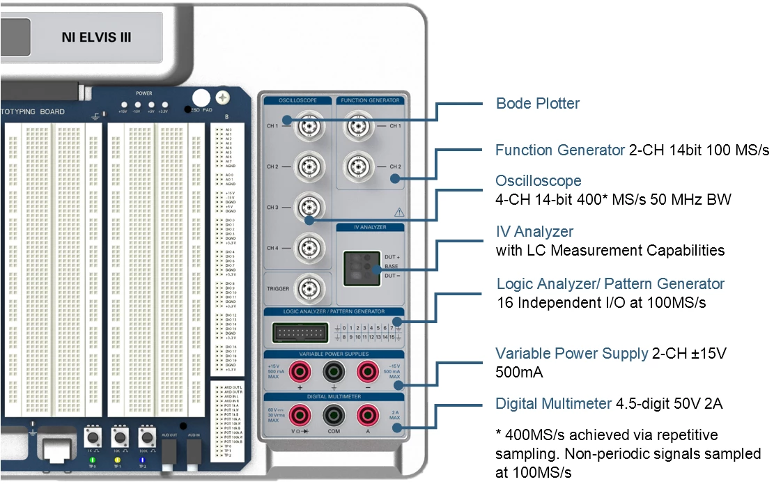 NI ELVIS IIIは、教育機関用に開発されたモジュール式の工学教育実験用デバイスです。NI ELVIS IIIにはオシロスコープ、デジタルマルチメータ、関数発生器、可変電源、ボーデアナライザ、およびその他の一般的な実験用の計測器が含まれています。