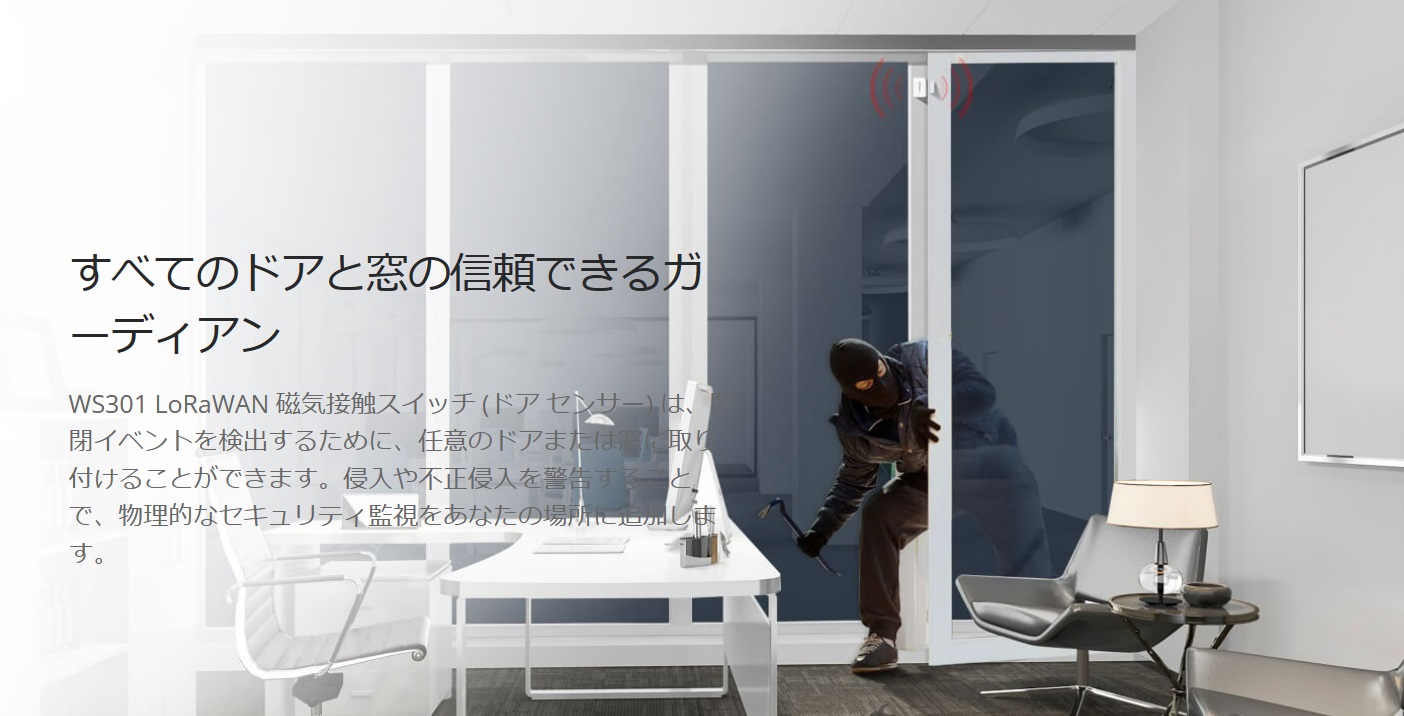WS301 LoRaWAN 磁気接触スイッチ (ドア センサー) は、開閉イベントを検出するために、任意のドアまたは窓に取り付けることができ、侵入や不正侵入を警告します。