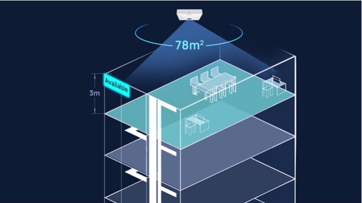 推奨高さ3mに設置した場合、78平方メートルの広範囲をカバーします。どんな場所にも隠れることなく、ワークプレイスの上に設置することができます。