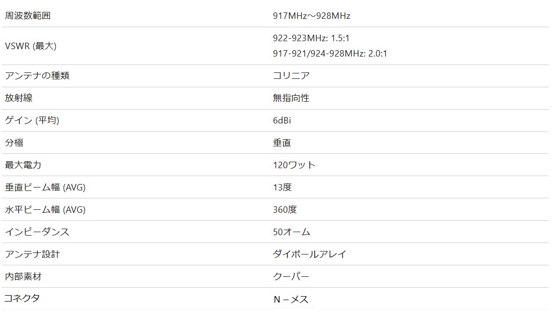 917MHz から 928MHz の範囲の周波数で動作し、6dbi の高ゲインと 13 度の垂直ビーム幅を備えています。アンテナは長さ 1474mm の直線で構築され、UV 耐性があり、過酷な環境での使用に適しています。