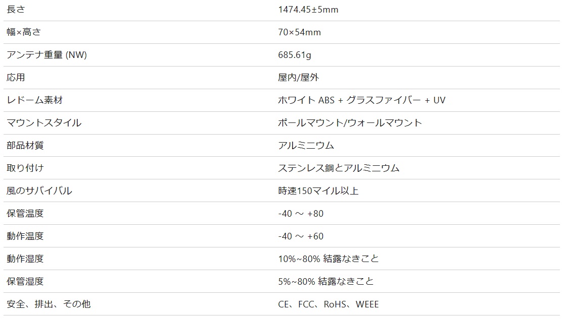 アンテナは長さ 1474mm の直線で構築され、UV 耐性があり、過酷な環境での使用に適しています。内蔵の金属ブラケットを使用して、アンテナをポールまたは壁にまっすぐに固定できます。メスコネクタはN型です。