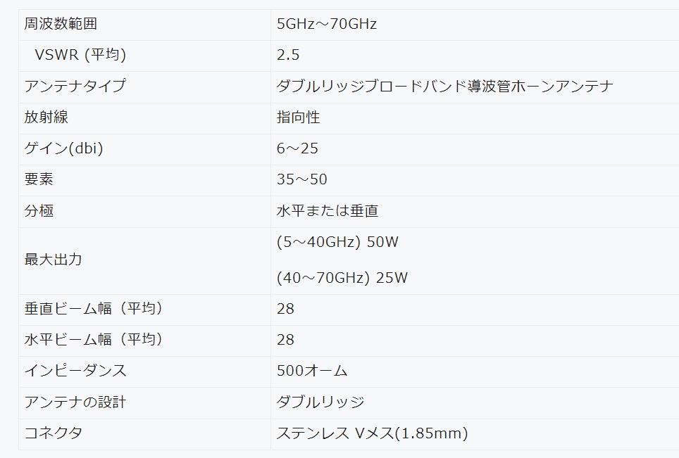 ホーンアンテナ 5GHz ~ 70GHz の特長 製品概要5 GHz ~ 70 GHz ダブルリッジブロードバンド導波管ホーンアンテナ、V メスコネクタ (1.85mm)EMC/EMI テストアンテナ● 周波数:5~70GHz● 寸法 (mm): 38x55x74mm● 重量(N.W.):70g主な特徴高出力 500W (ピーク)DC 短絡雷保護低 VSWR均一ゲイン統合パフォーマンスデータベース6061 アルミニウム合金仕様