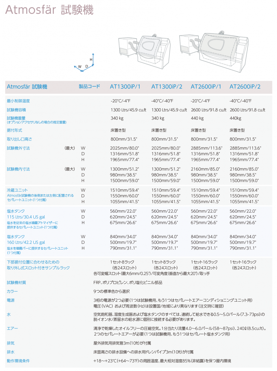 | 従来の塩水噴霧モード | 温度範囲 塩水噴霧量 | 周囲温度~ +50°C/の範囲で調整可能 1時間当たり0.5~2.5ml/80cm2 の範囲で調整可能 |