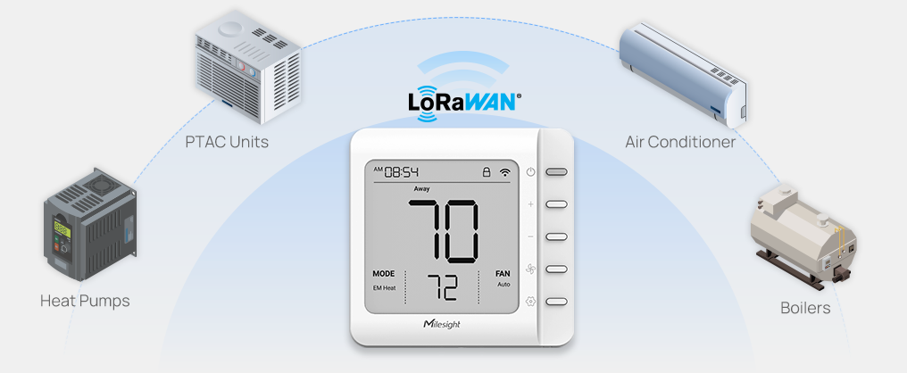 独自のMilesight LoRa®ベースのプロトコルは、ゲートウェイなしでスマートサーモスタットと他のMilesight LoRaWAN®デバイス間の通信を1秒以内に簡単に行うことを可能にします。さらに、サーモスタットにはインテリジェントな稼働検知機能が搭載されており、迅速な連携を確立し、HVACシステムを効率的に制御します。
