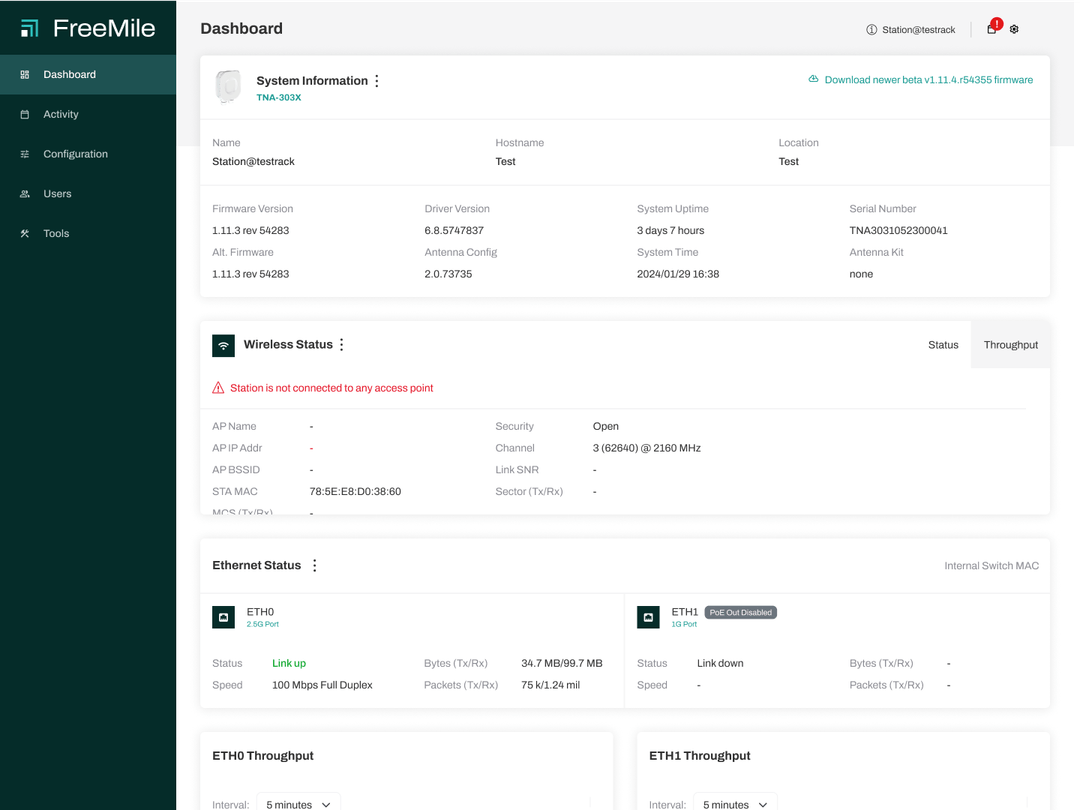 SAF Freemile は、デバイスの監視と管理のための RESTful API を提供します。この API により、統計の取得、構成の変更、ファームウェアのアップグレードが容易になります。最新の Web インターフェイスと SNMPv2+v3 は、監視とトラップに使用できます。管理は IPv4 ネットワーク経由で利用できるため、複雑な外部サービスやサーバーは不要です。