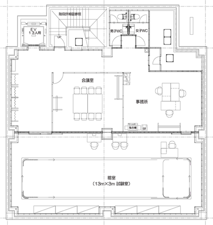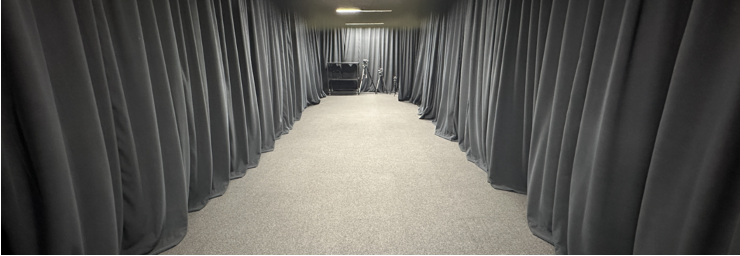 16mx6mの個室内に13mx3mの仮設暗室を設置しました。\n仮設暗室は試験内容によって長さが可変でき、吸気口と換気口を別に設けてありますので快適な試験が行えます。